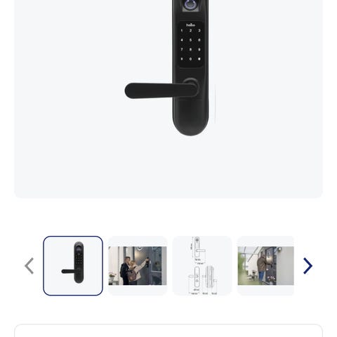 Låsen har flere åpne- og låsefunksjoner, blant annet fingeravtrykk, kode, app-styring og nøkkel. På innsiden er det håndtak og berøringspanel med talltastatur. Produktet leveres med monteringsutstyr som skruer, festebeslag og nødvendige deler for installasjon på dør, samt batterier.
