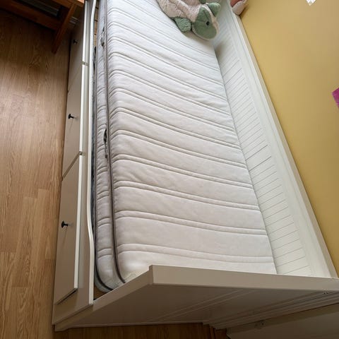 Solid utførelse i heltre furu som er hvitlasert. Madrass-størrelse: 90x200 cm. Fås med på kjøpet om ønskelig. Denne modellen kan også passe godt på hytta. Nypris tilsvarende modell er ca 7.000 kr.