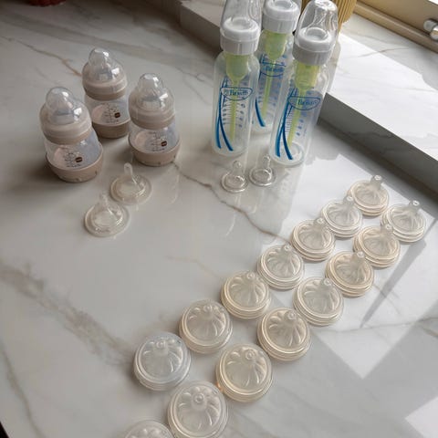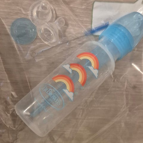 Jeg selger fire flasker med dr brown fra 20 ml til 125 passer til prematur. Selger også to hånd pumper av dr browns