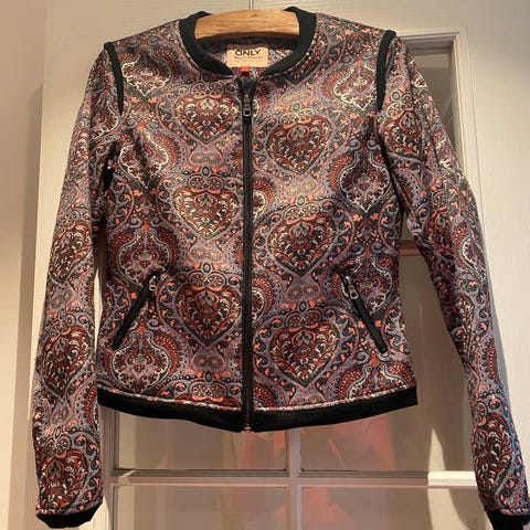 Isabel Marant Étoile jakke for dame i størrelse S. Jakken er laget i silke og har et flerfarget mønster med kontrastfargede ermer. Den har glidelåslukking foran og ribbestrikkede kanter i hals, nederkant og ermeåpninger.