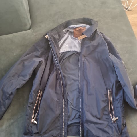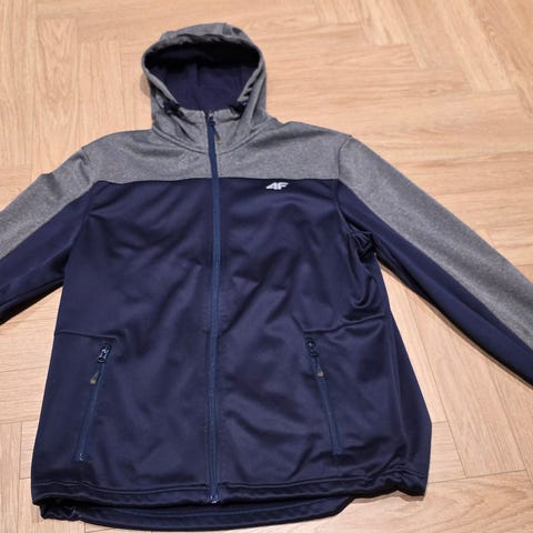 4F NeoDry vinterjakke for herre i størrelse L og bukse i størrelse XL . Jakken er grå utvendig med blå, vattert innside i rutemønster. Den har hette, glidelås med klaff foran og elastisk snøring nederst. NeoDry-materialet er utviklet for å være vannavvisende og vindtett, samtidig som det puster. Jakken og bukseen passer som ytterjakke i vinterhalvåret og til bruk i hverdagen eller til enklere friluftsaktiviteter.