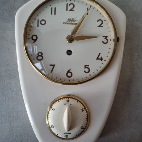 Vintage analog kjøkkenklokke med integrert minuttviser. Ideell for kjøkkenet eller annen plass som trenger en timer og klokke. Retro-futuristisk stil.