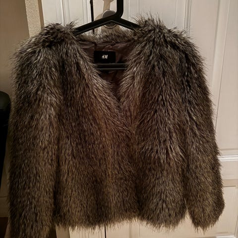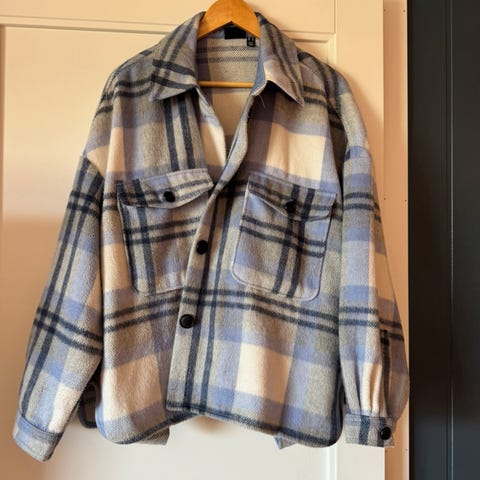 H&M jakke for dame i størrelse S. Jakken er laget i ullmateriale og har et flerfarget rutemønster i jordtoner. Modellen har krage, knappelukking foran og to store brystlommer med klaff. Passformen er rett og noe romslig, egnet som en lett ytterjakke eller overshirt i overgangssesonger.