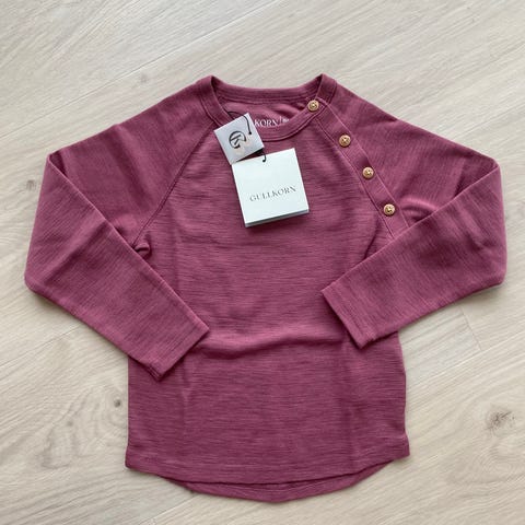 Gullkorn ullgenser til barn i størrelse 104. Genseren er brun og laget i ull. Modellen har lange ermer og knapper langs skulderen for enklere av- og påkledning. Passer som unisex-plagg og kan brukes både som innerlag og mellomlag i kjøligere vær.