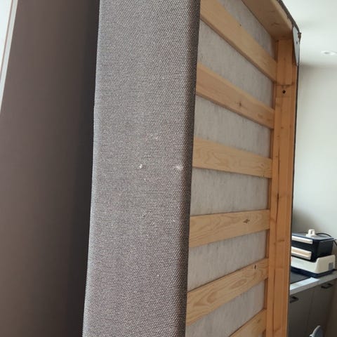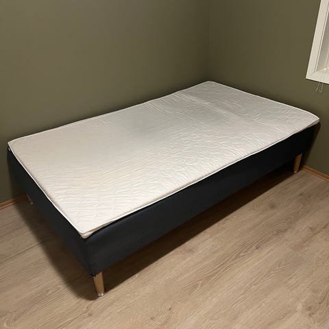 Jysk seng med grå tekstiltrukket ramme og sylinderformede ben i metall. Sengen har en polstret ramme rundt madrassen og står på flere metallben som gir stabilitet og luft under sengen. Passer som vanlig seng i soverom eller gjesterom. Størrelse og madrass-spesifikasjoner er ikke oppgitt.