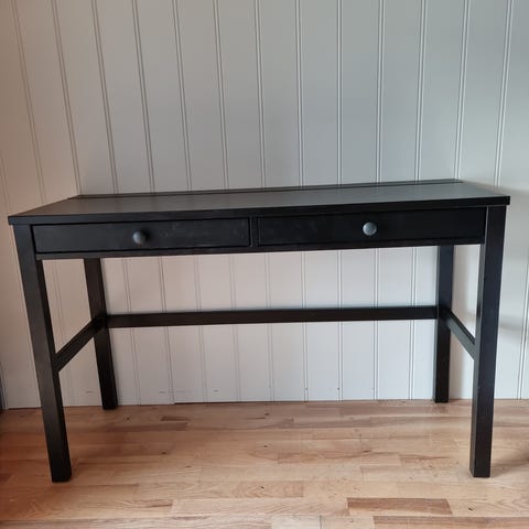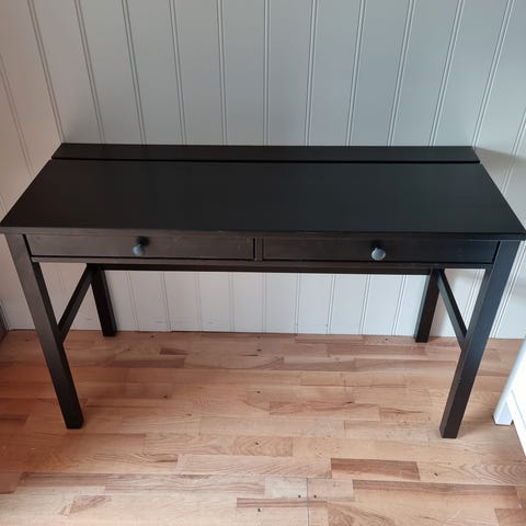 Et pent brukt skrivebord med sammenleggbare plater på hver side. Fleksibel bordløsning med skuff på midten. Én ripe på platetoppen. Bredde på skrivebordet uten sidebord slått ut: 73cm.