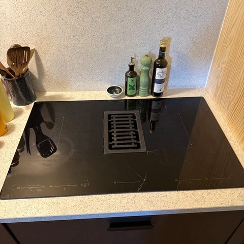 Induksjonstoppen har en glasskeramisk overflate med flere kokesoner markert på platen. Betjeningspanelet er plassert i front med berøringsknapper for regulering av varme. Toppen er beregnet for innbygging i benkeplate på kjøkken.