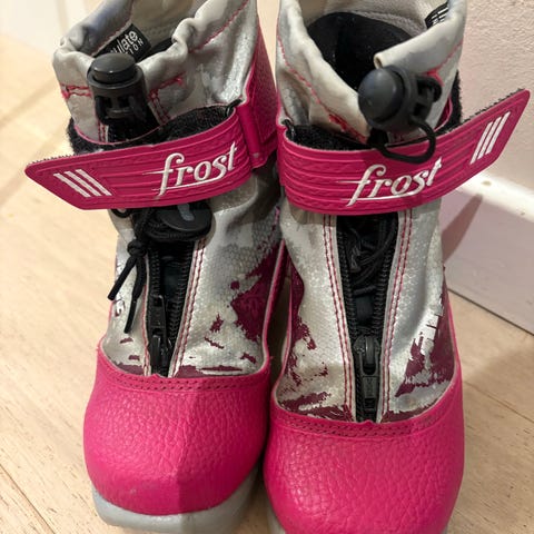 Disse er godt brukt og noe av mønsteret på utsiden er slitt. Har imidlertid vært i bruk frem til nå, og fungerer som de skal. Har både snøring og glidelås.