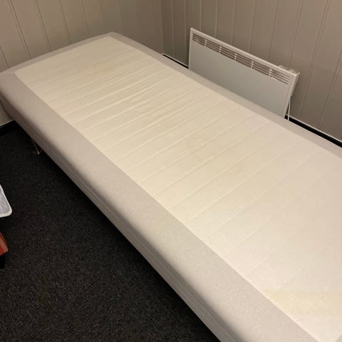 Godt brukt, men med overmadrass over! Selve madrassen er fremdeles fast, stram og fin. Lite flekker. Veldig god å ligge på!