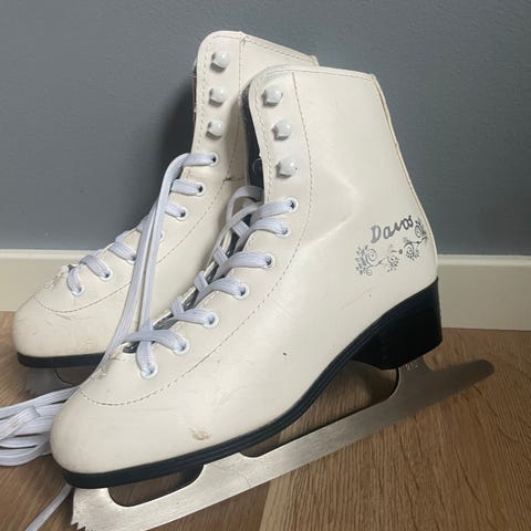 Davos FS-41 kunstskøyter for barn i størrelse 27. Klassiske hvite skøyter med snøring og stålklinge. Overdel i syntetisk materiale med polstret pløse for økt komfort. Egnet til bruk på isbaner og skøytebaner til lek og enkel skøyting. Skøytene har noen synlige riper og merker i overflaten. Klingen bør kontrolleres og eventuelt slipes før bruk.