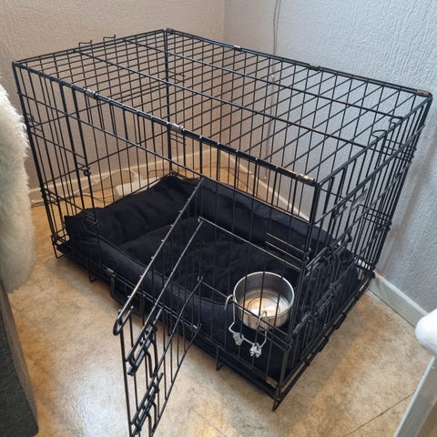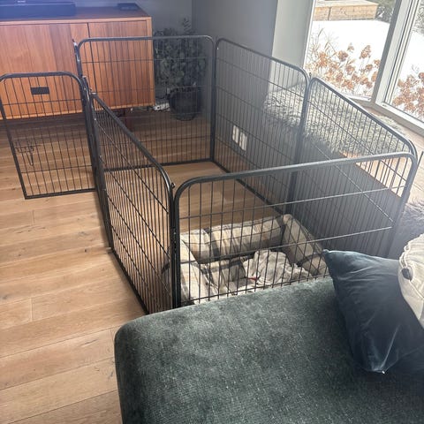 Sammenleggbar valpegård/hundegård i metall med svart finish. Består av flere paneler som kan settes sammen i ulike fasonger, for eksempel firkantet eller åttekantet. Ett av panelene har dør med lås for enkel inn- og utgang.