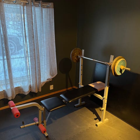 Vektstang med flere vektskiver med til sammen 22,5 kg. Egnet til styrketrening hjemme, som knebøy, markløft, skulderpress, curl og lignende øvelser. Perfekt for hjemmetrening.