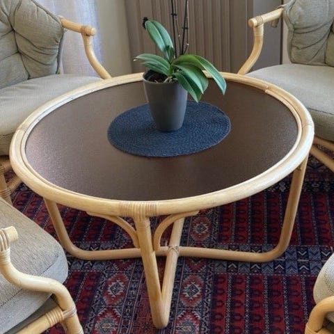 Vintage bord i glass/bambus, kr 500. Bittelitt av bambus må festes med lim på bein, se bildet.