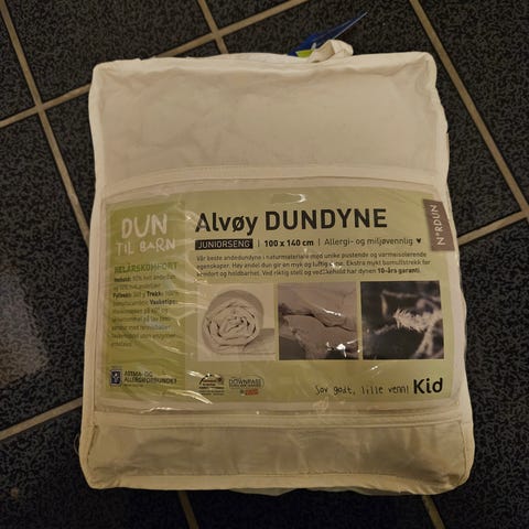 Alvøy Junior dundyne og pute fra Kid. Str 100x140 cm på dyne og 40x60 cm på pute. Pent brukt uten flekker.