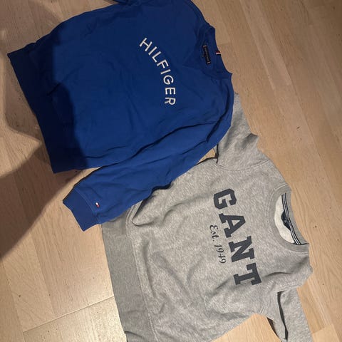 Blå hettegenser. Denne har et lite hull på magen. Se bildet.