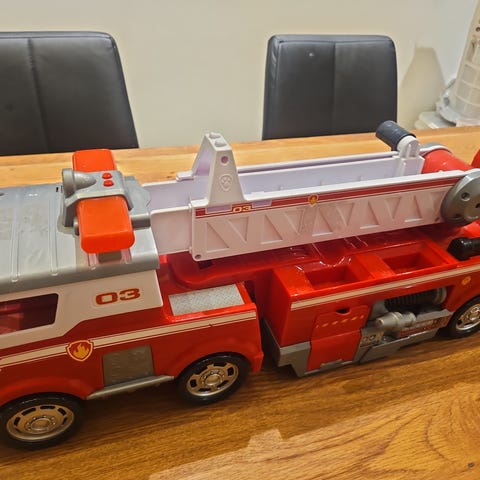 Stor brannbil med uttrekkbar stige og flere bevegelige deler. Inkluderer Marshall. Avtagbare stiger. To vannballer til kanonen. Og lyd.