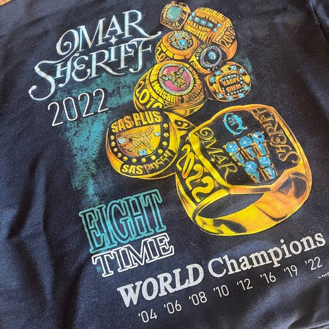 Omar Sheriff/Karpe merch (8 time world champion )t skjorte til salgs. Størrelse xxl.