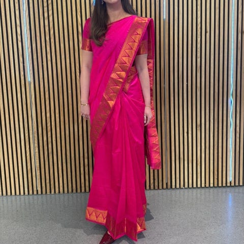 Lilla sari for dame med dekorativ gullfarget og rosa bord langs kantene. Stoffet har vevd mønster i lilla og gulltoner, med blomster- og bladmotiv. Sariens kant har markert, bred bord med kontrastfarger.
