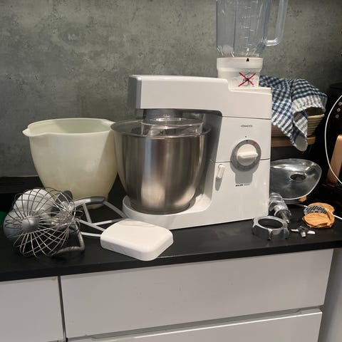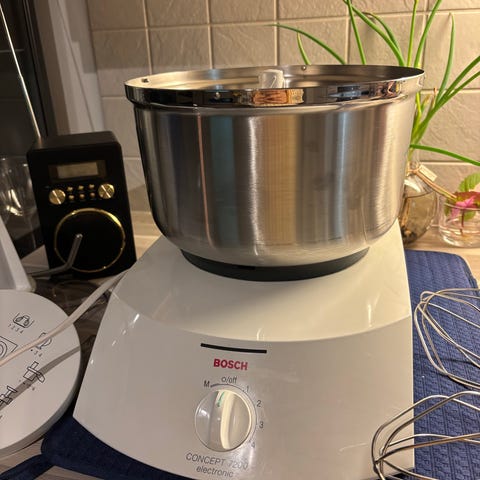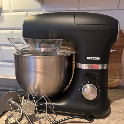Modellen har en stor bolle i metall og sprutbeskyttelse i plast. Hastigheten justeres med dreiehjul på siden. Egner seg til elting, visping og blanding av ulike typer deig og rører på kjøkkenet.