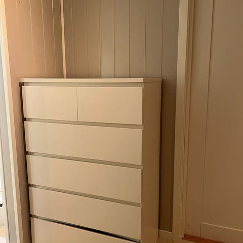 Malt med blank gulvmaling i lys grå farge. Knottene er byttet, ei skinne er byttet ut og fungerer veldig fint. De resterende skuffeskinnene er mer eller mindre ødelagt. Skuffene fungerer i kommode, men bør byttes. Fin kommode som kan passe til lagring på kott eller lignende. Kastes tirsdag 10. feb om ikke hentes.