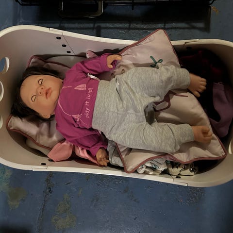 Rosa retro dukkeseng på hjul som kan legges sammen. Dukkesengen er 52,5 cm lang, 30 cm bred og 38,5 cm høy.