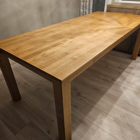 Godt brukt spisebord - men med mye bruk igjen. 190x100 m med ileggsplate i. Er noen bruksmerker i - se bildet. Kan pusses og oljes på nytt og da vil de nok bli mindre synlig. Det største merket (svart sirkel) er på ileggsplaten. Må hentes.