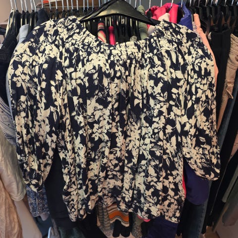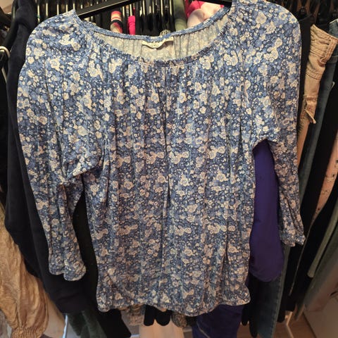Cubus bluse i flerfarget mønster for dame. Blusen er i medium og laget av viskose. Den har vid, elastisk utringning som kan brukes båret opp på skuldrene eller mer ned mot skuldrene, samt trekvart lange ermer med lett puff. Stoffet er lett og mykt med trykk i ulike blå og lyse toner. Passer til hverdagsbruk og kan kombineres med både bukser og skjørt.