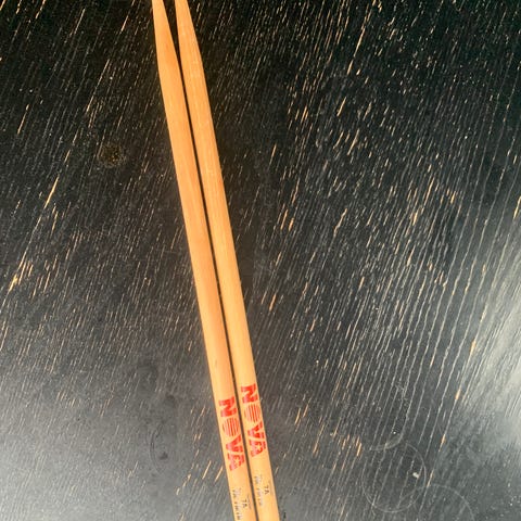 Trommestikker i tre i naturfarge. Settet består av to par trommestikker i ulik lengde, egnet til bruk med trommesett eller andre perkusjonsinstrumenter. Passer til øving og generell trommespill. Lengde fremgår av bildet med målebånd. 100 kr pr par.