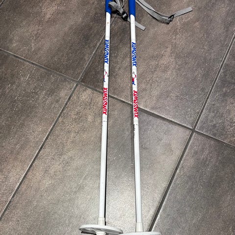 Frost skistaver i lilla og hvit farge. Stavene har håndtak med stropper og runde trinser nederst.