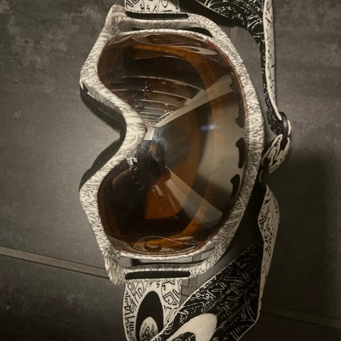 Oakley skibriller med oransje linse og svart ramme. Bred, justerbar stropp med Oakley-logo. Myk skumkant på innsiden for komfort mot ansiktet. Egner seg til bruk i alpinbakke og annen vintersport der man trenger beskyttelse for øynene mot vind og snø. En liten skramme på den, som kan synes på bildet, men ikke noe som plager en når man har de på og ellers i god stand