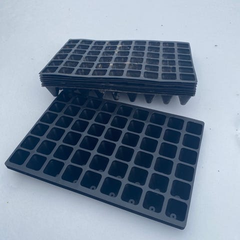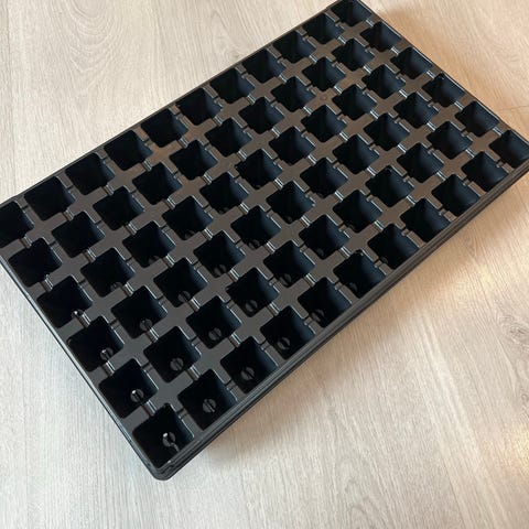 Såbrett i plast med mange små celler, egnet for forkultivering og oppal av planter. Brettet har firkantede planteceller i jevnt rutenett og er laget i svart plast. Passer til dyrking av frø og småplanter innendørs, i drivhus eller på veranda. Kan brukes om igjen ved forsiktig håndtering og rengjøring mellom sesonger.
