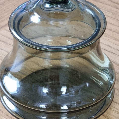Krukken er i sotet glass og lokket i koboltblått glass.