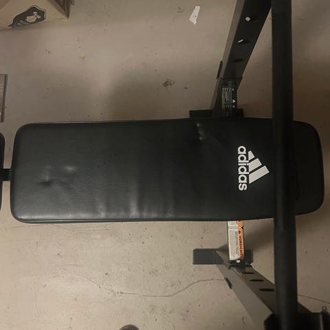 Adidas treningsbenk med integrert vektstangstativ. Benken har polstret rygg- og sittepute for støtte under styrketrening. Vektstangstativet er festet til rammen og egnet for trening med frivekter. Passer til øvelser som benkpress og andre overkroppsøvelser. Farge hovedsakelig svart med Adidas-logo på ryggputen. Vektskiver i 5 og 10kg og vektstang som vises på bildene følger med. Hull i den avtagbare delen, eller pent brukt.