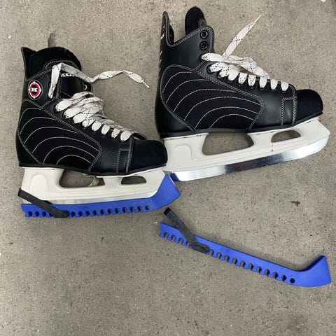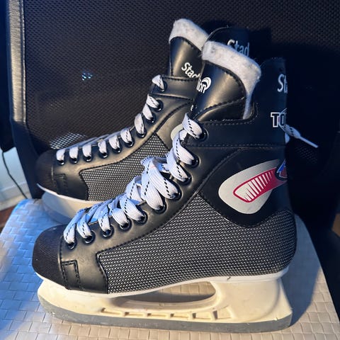 Canada ishockeyskøyter i størrelse 42. Skøytene har grå og svarte overmaterialer med røde og hvite detaljer. Overdelen er snørelukket med polstret pløse og ankelparti for støtte rundt foten. Innsiden er fôret for økt komfort. Under sitter en svart skøytestålramme tilpasset ishockeybruk. Egner seg til ishockeyspill og generell bruk på is for voksne eller større ungdommer som bruker størrelse 42.