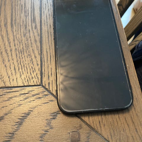 Iphone 15, 128 gb. Noko knust på skjermen bak, men har ikkje noko å sei for bruken av "knappen" bak.