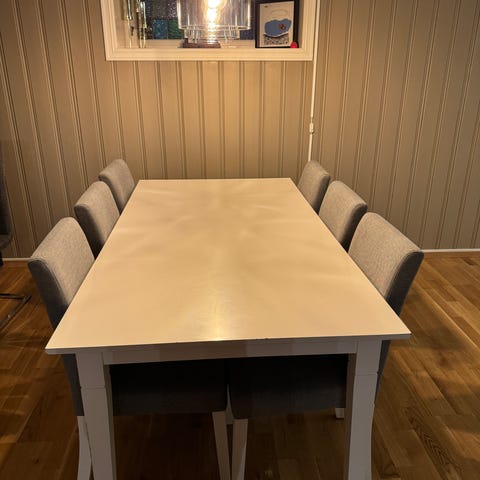 Her får du ett spise bord som er meget spesielt. Det er laget av en proff snekker. Sitte høyde på benker er ca 45cm. Selges til en latterlig pris ved hurtig henting