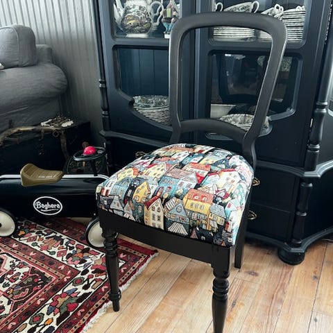 En flott stol som har gjennomgått oppussing. Nytt trekk, fjærer og sete som gjør den behagelig å sitte på. Det er merker på frambena etter bordbena (se bilder)
