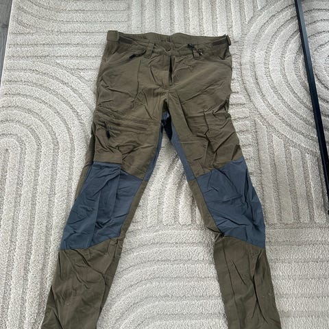 Jotunheim skarstind turbukse i beige med mørke forsterkede felt på knær og sete i str L. Buksen har flere lommer, blant annet lårlomme med glidelås.