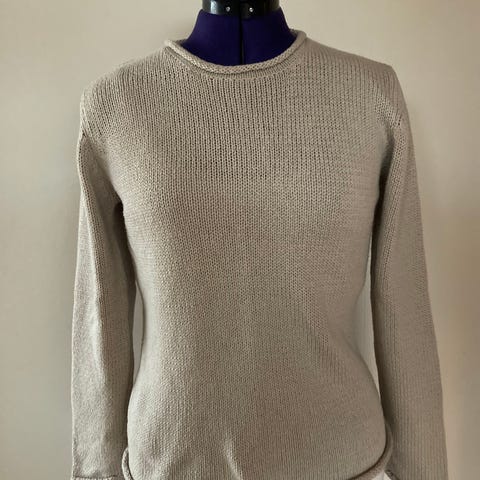 V genser i 62% bomull,26% viskose, 10% lin og 2% polyester. Rullekant nede på bol og ermer. Lett innsvinget. Bryst 94 cm, lengde 51 cm. Størrelse 40.