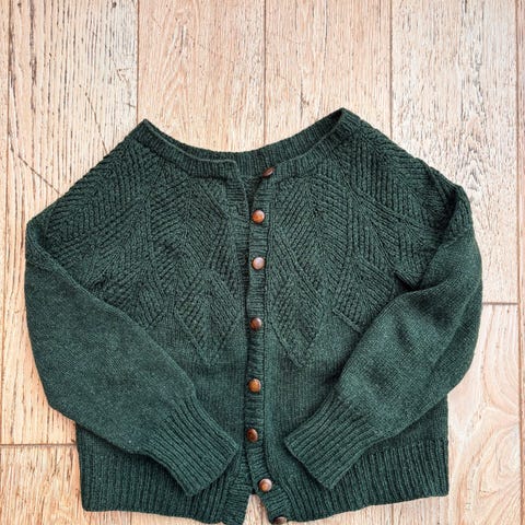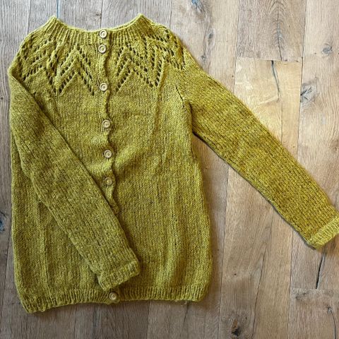 «Koftan Siri» strikket av meg i 100 % ull fra Iona-øyene i Skottland. Garnet er litt stikkete, men veldig høy kvalitet og slitesterkt. Jakka er litt liten for meg nå, se mål på bildet. En skarp gulfarge, trolig farget på grå base