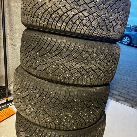 Kjerringa ga opp. Taklet ikke å kjøre piggfritt lengre og fikk seg nye piggdekk. Selger derfor 4 piggfrie vinterdekk. Har stått på Tesla model 3. ble brukt vinter 24-25 og 25-til nå.
