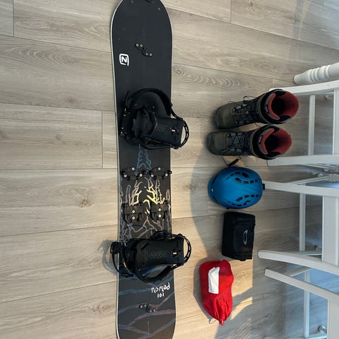 Burton Blunt snowboard med tilhørende Burton-bindinger og snowboardstøvler. Snowboardet er 151 cm langt, med grafisk design på overside og underside. Bindingene er justerbare og montert på brettet. Snowboardstøvlene fra Burton er svarte med lisser og grov såle. Settet leveres også med polstret snowboardbag med rutete mønster og bærehåndtak. Egnet for bruk i alpinbakke og park, og passer for brukere som ønsker et komplett snowboardoppsett med brett, bindinger, støvler og bag.