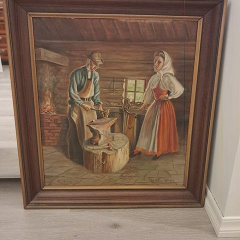 Stort, flott gammelt oljemaleri, "Smed og kvinne i smien", på lerret. Arvegods. Maleriet har vært i samme familie fra før 1970.