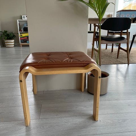 Flott retro krakk i heltre mahogni / teak fra Aarflot Møbler med fine detaljer og sete trukket i skai. Godt håndverk og design. Trekket er helt og pent. Nydelig patina. Krakken er nylig pusset og oljet. Kan fint stå alene eller brukes sammen med lenestol.