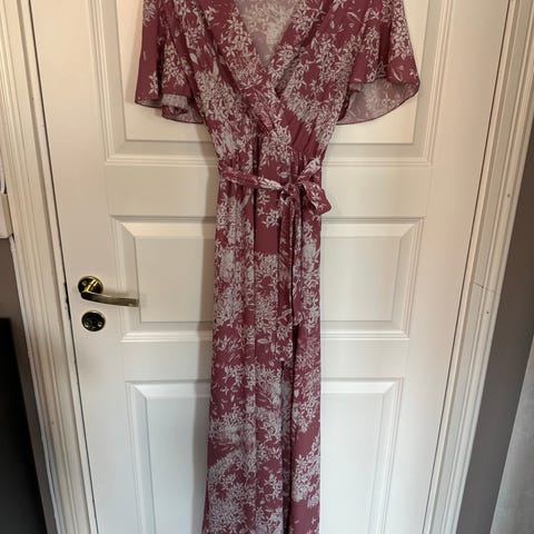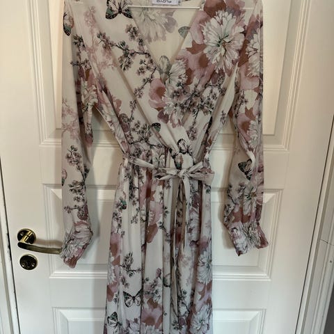 Floyd sommerkjole i størrelse S for dame. Kjolen er flerfarget med blomstrete mønster i hovedsaklige pastelltoner. Materiale i polyester. Modellen har kort erm, V-utringning og knytebelte i livet. Lengden går omtrent til leggen, og passformen er lett og fallende. Egnet som sommerkjole til hverdagsbruk eller enklere selskapelige anledninger.