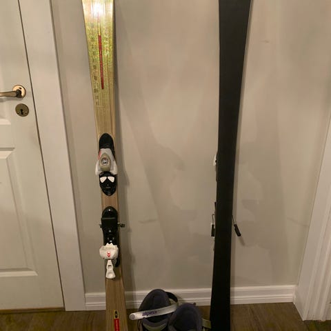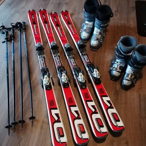 Salomon alpinski med bindinger og Nordica alpinstøvler rød
