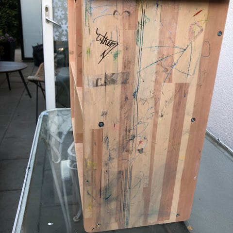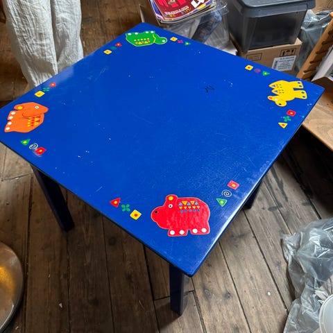 Det er tegnemerker, klistremerker og små riper på bordet noen steder.