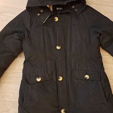 Svea dunjakke for dame i størrelse M. Jakken er svart og fylt med dun, med horisontale vatterte paneler for jevn isolasjon. Den har hette med pelskant, høy krage og glidelås foran med klaff. Modellen har ribbestrikkede mansjetter i ermene og sidelommer med glidelås. Egnet som ytterjakke i kaldt vær.