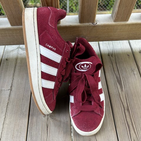 Adidas Campus sneakers i størrelse 44. Modellen er i rødt semsket skinn med hvite Adidas-striper på sidene og lys mellomsåle med yttersåle i gummi. Overdelen har klassisk Campus-design med snøring og polstret hælparti. På mellomsålen ved hælen er det håndtegnede illustrasjoner/dekor. Passer som fritidssko og hverdagsbruk.