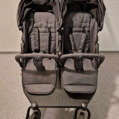 Beemoo søskenvogn i grått tekstil. Vognen har to separate sitteenheter side om side, hver med justerbare seler og kalesje. Under setene er det oppbevaringskurver. Håndtaket er i ett stykke for enkel styring. Egner seg for to barn samtidig, for eksempel tvillinger eller søsken med liten aldersforskjell.